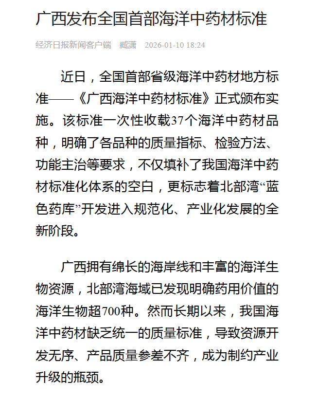 近日,全国首部省级海洋中药材地方标准——《广西海洋中药材标准》正式颁布实施。该标准一次性收载37个海洋中药材品种,明确了各品种的质量指标、检验方法、功能主治等要求,不仅填补了我国海洋中药材标准化体系的空白,更标志着北部湾“蓝色药库”开发进入规范化、产业化发展的全新阶段。