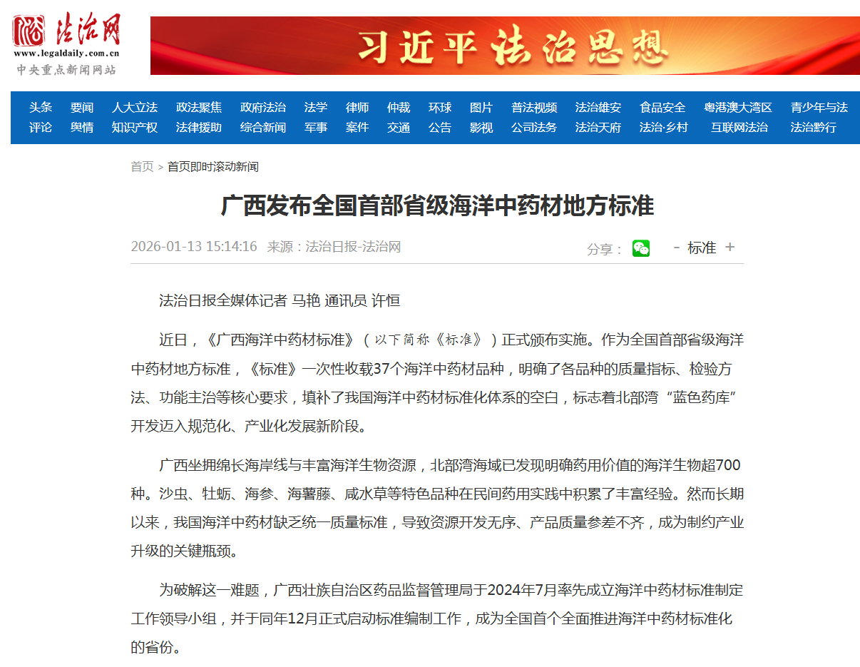 近日,《广西海洋中药材标准》(以下简称《标准》)正式颁布实施。作为全国首部省级海洋中药材地方标准,《标准》一次性收载37个海洋中药材品种,明确了各品种的质量指标、检验方法、功能主治等核心要求,填补了我国海洋中药材标准化体系的空白,标志着北部湾“蓝色药库”开发迈入规范化、产业化发展新阶段。