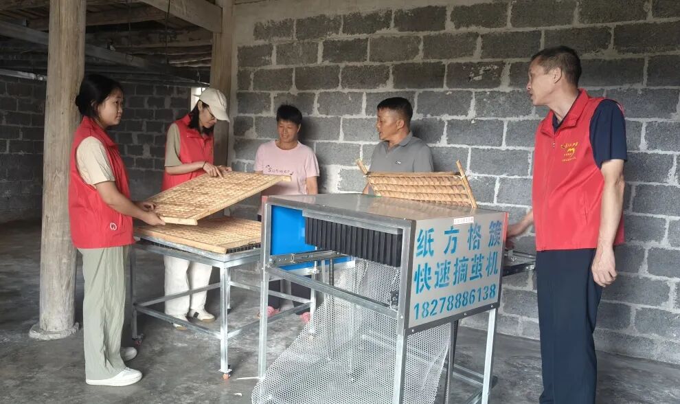 驻村工作队员到蚕农家指导高效率使用摘茧机