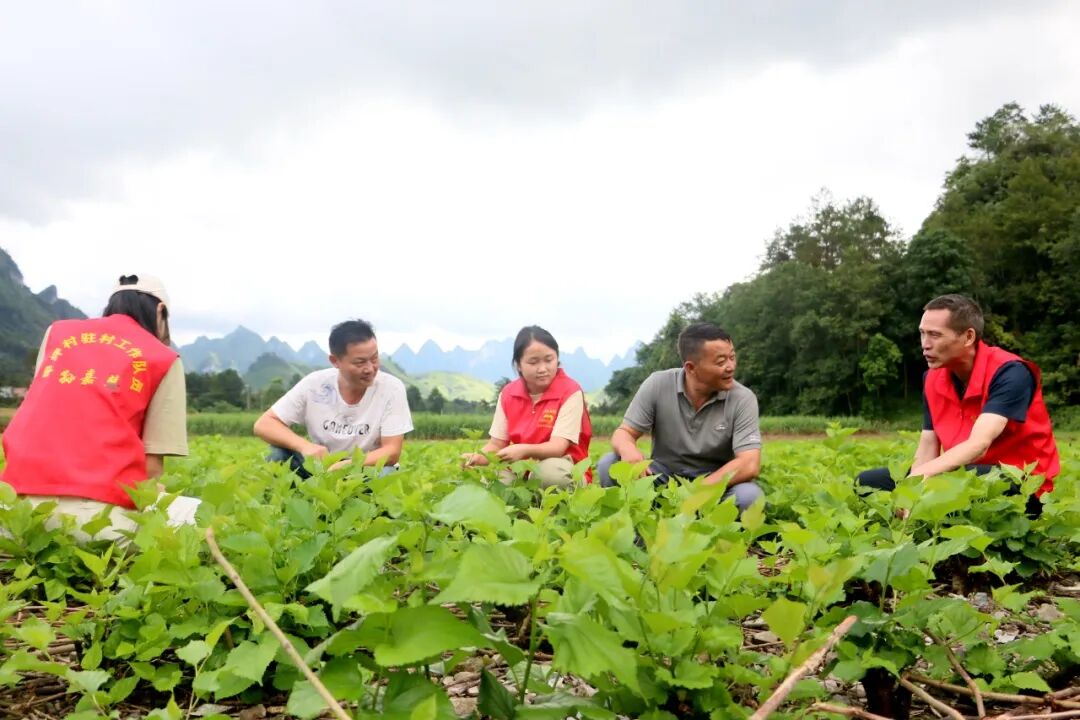 甲坪村驻村第一书记刘立龙带领工作队到桑叶地查看桑叶长势