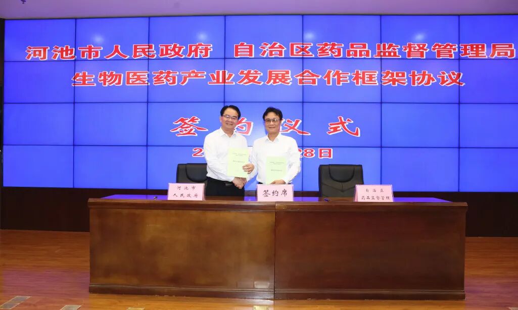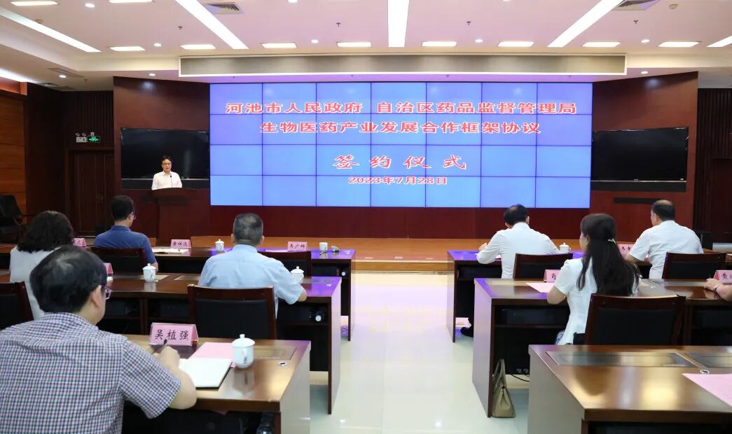 为贯彻落实自治区党委政府关于完整准确全面贯彻新发展理念推动高质量发展、建设壮美广西的共同目标,7月28日, IM体育与河池市人民政府在南宁市签订《生物医药产业高质量发展战略合作框架协议书》,共同推动以药品、医疗器械和化妆品产业为重点的河池医药产业高质量发展。 IM体育党组成员、副局长韦广辉,河池市人民政府副市长陆景宇分别在签约仪式上致辞,并代表双方签约。